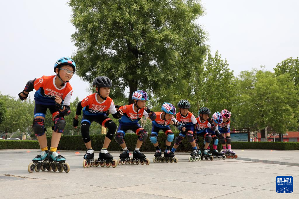 7月13日,小朋友们在山东省滨州市博兴县一家轮滑培训机构练习轮滑。