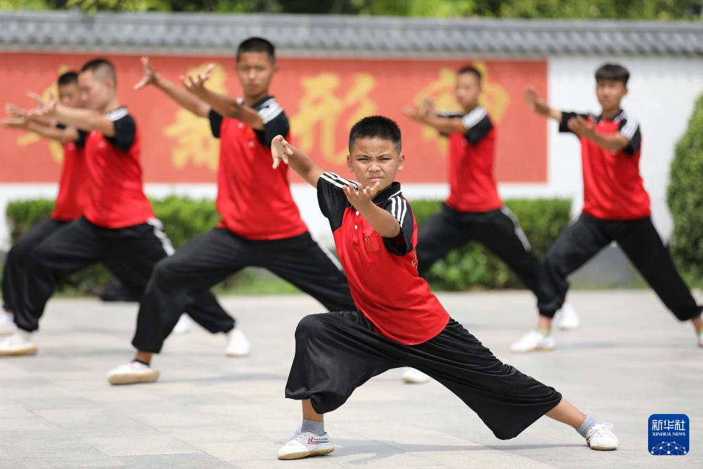 7月13日,在河南省焦作市温县一家太极拳武校,青少年学员在练习太极拳。