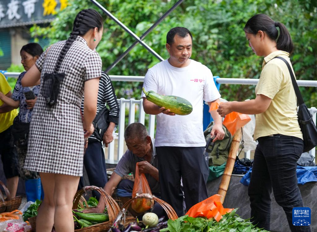 7月10日,在重庆市忠县县城,秦大益(前右二)帮助年龄较大的菜农挑菜前往售卖点。