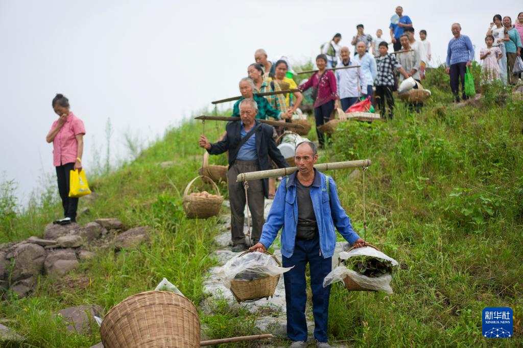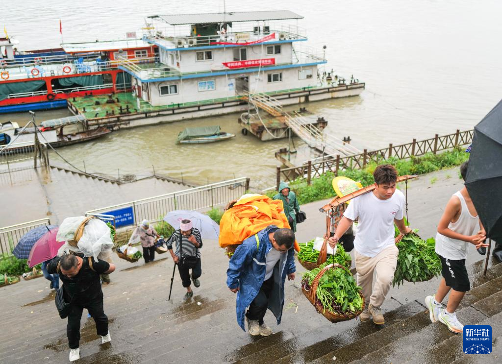 7月11日,重庆忠县县城西山渡口码头的坡道上,秦大益(右三)和儿子秦源泽(右二)一起帮着年纪大的菜农运送满载蔬菜的背篓和箩筐。