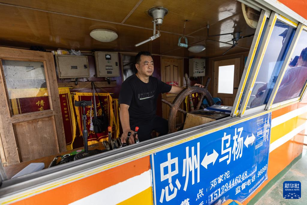 7月10日,“渝忠客2180”客轮开行中,秦大益的儿子秦源泽(左)站在驾驶室外进行直播。