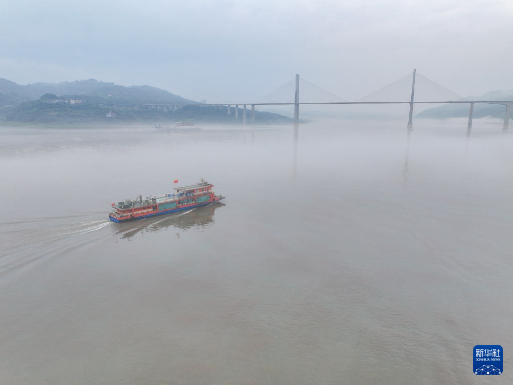 7月10日,“渝忠客2180”客轮开行中,曹利芳站在船头用手机向网民们展示薄雾中迷人的长江景色。