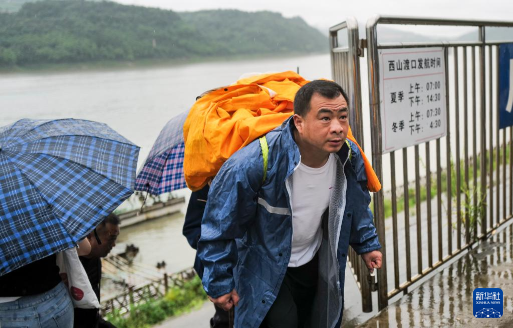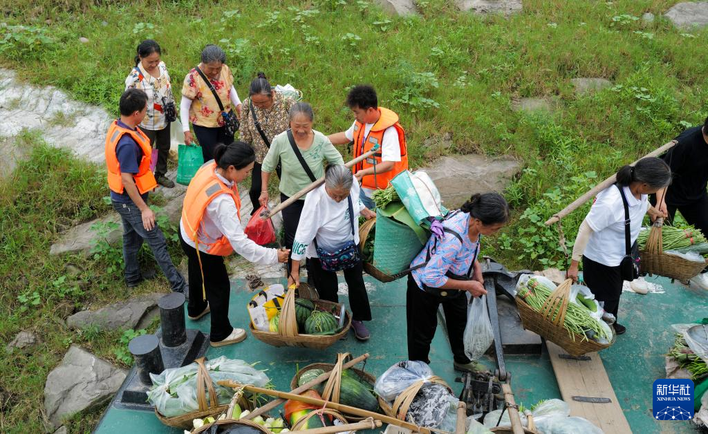 7月11日,重庆忠县县城西山渡口码头上,秦大益帮着年纪大的菜农背菜。