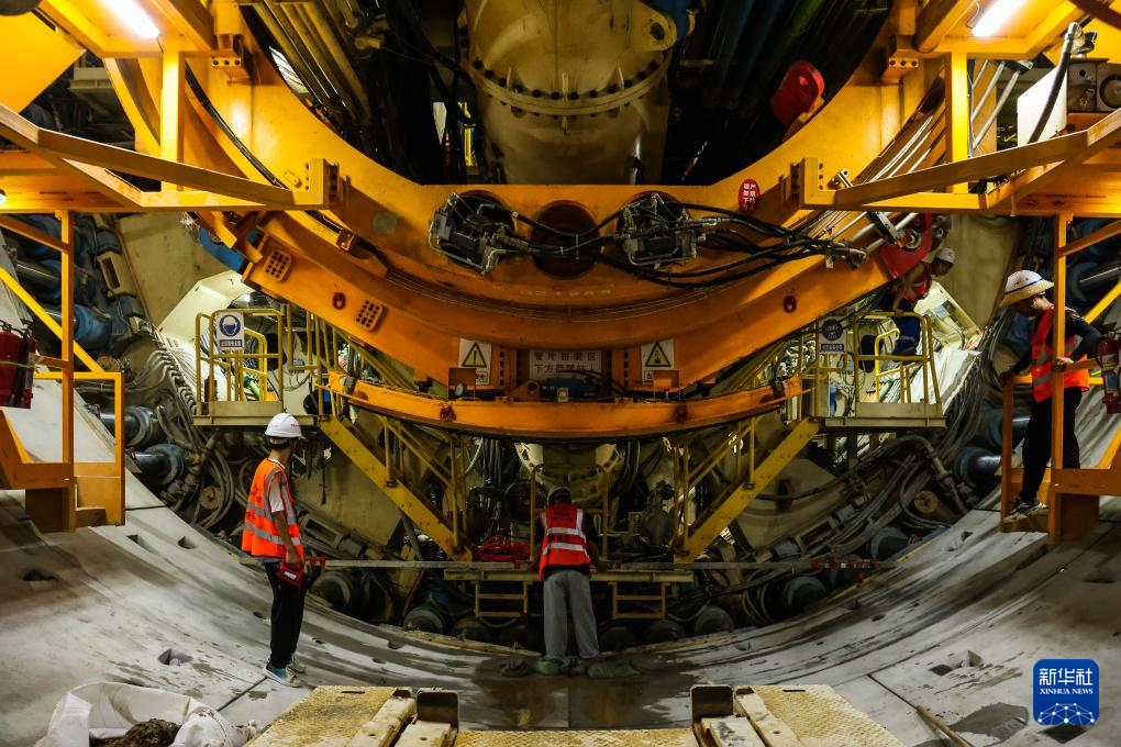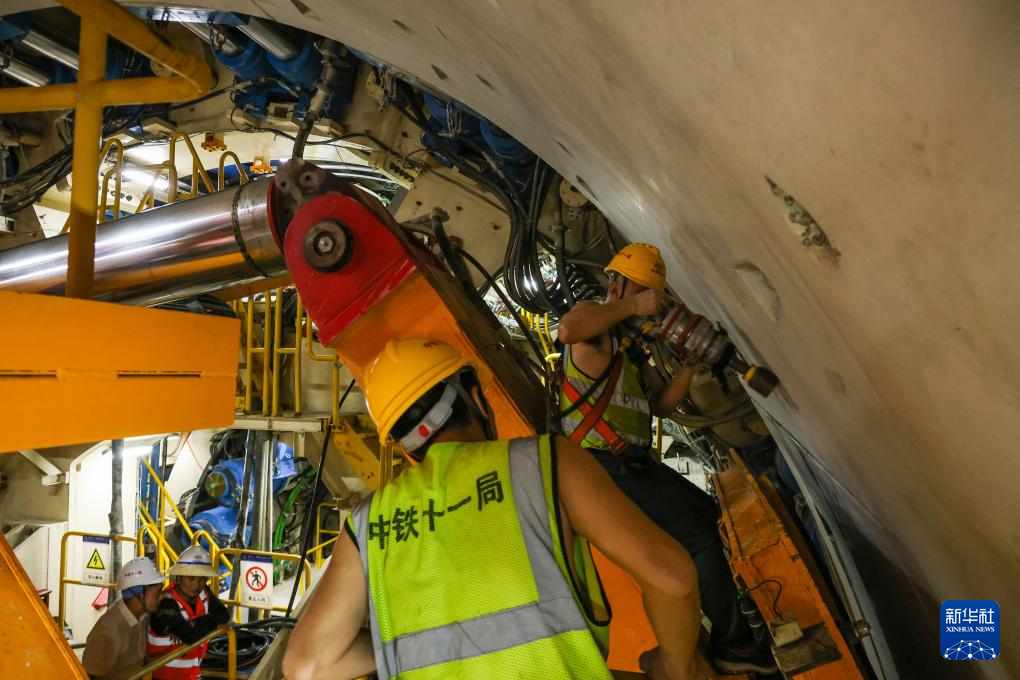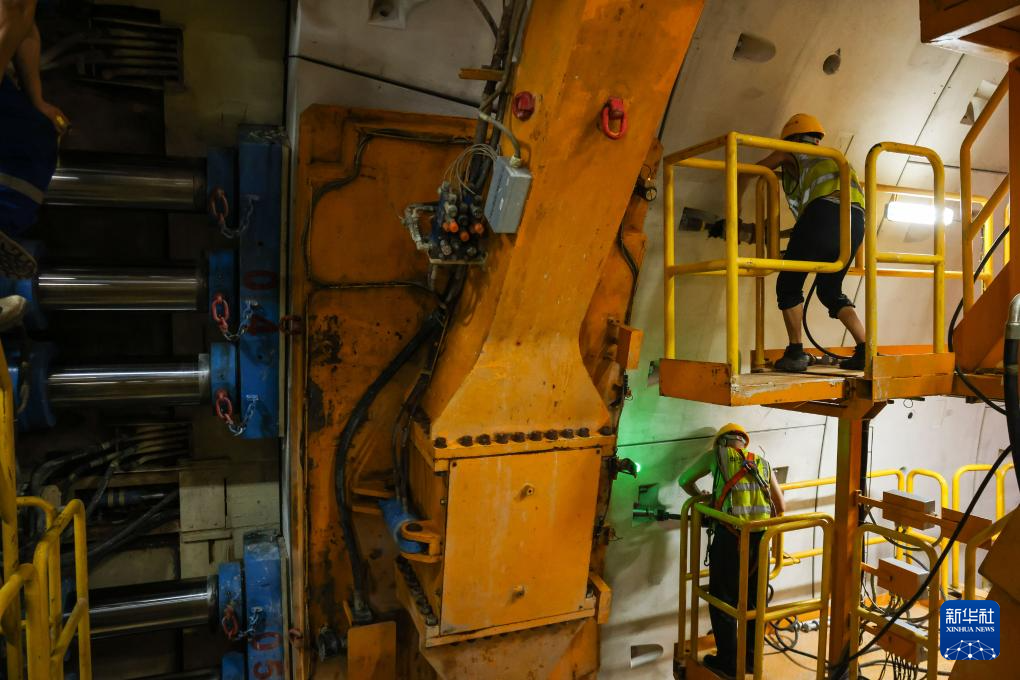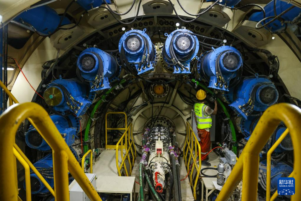 7月13日,施工人员在检查“鲲鹏号”盾构机刀头组件运行状况。
