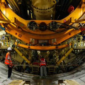 7月13日,施工人员在“鲲鹏号”盾构机内吊运物资。