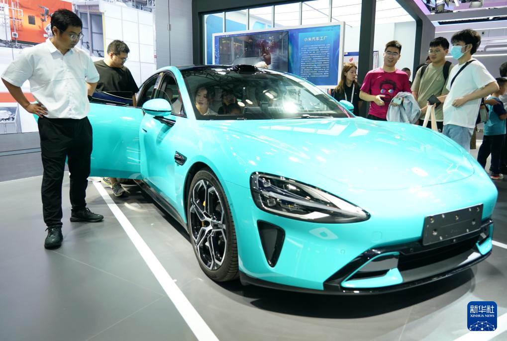 7月13日,参观者在北京科博会现场参观一款新能源汽车。