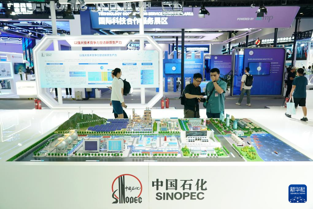这是7月13日在北京科博会现场拍摄的中国石化风光电制绿氢展览模型。