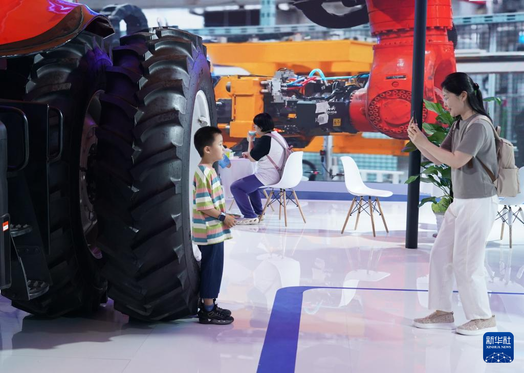 7月13日,参观者在北京科博会现场参观一款无人驾驶拖拉机。