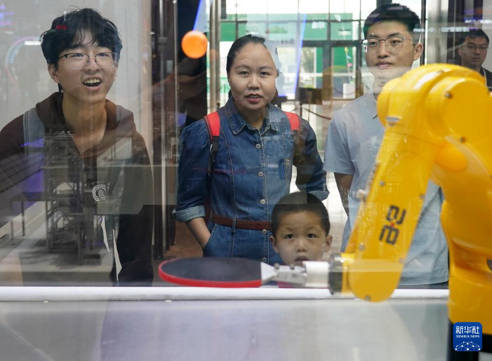 7月13日,参观者在北京科博会现场观看机器人打乒乓球。