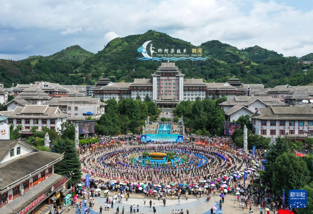 7月13日,少数民族群众在参加贵州剑河仰阿莎文化节民族文化巡演(无人机照片)。