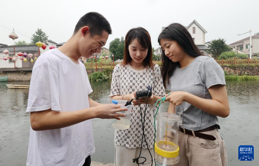 7月13日,浙江工业大学生物工程学院的大学生在舞阳街道上柏村对“水下森林”水质指标进行抽样检测。
