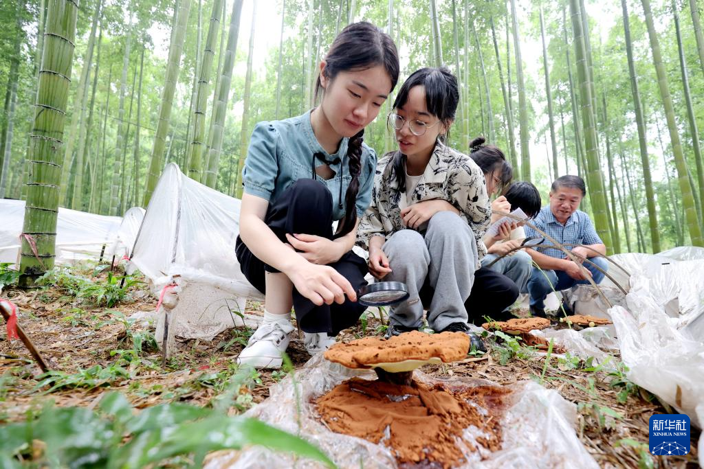 7月13日,浙江工业大学生物工程学院的大学生在舞阳街道塔山灵芝种植基地观察林下灵芝培育情况。