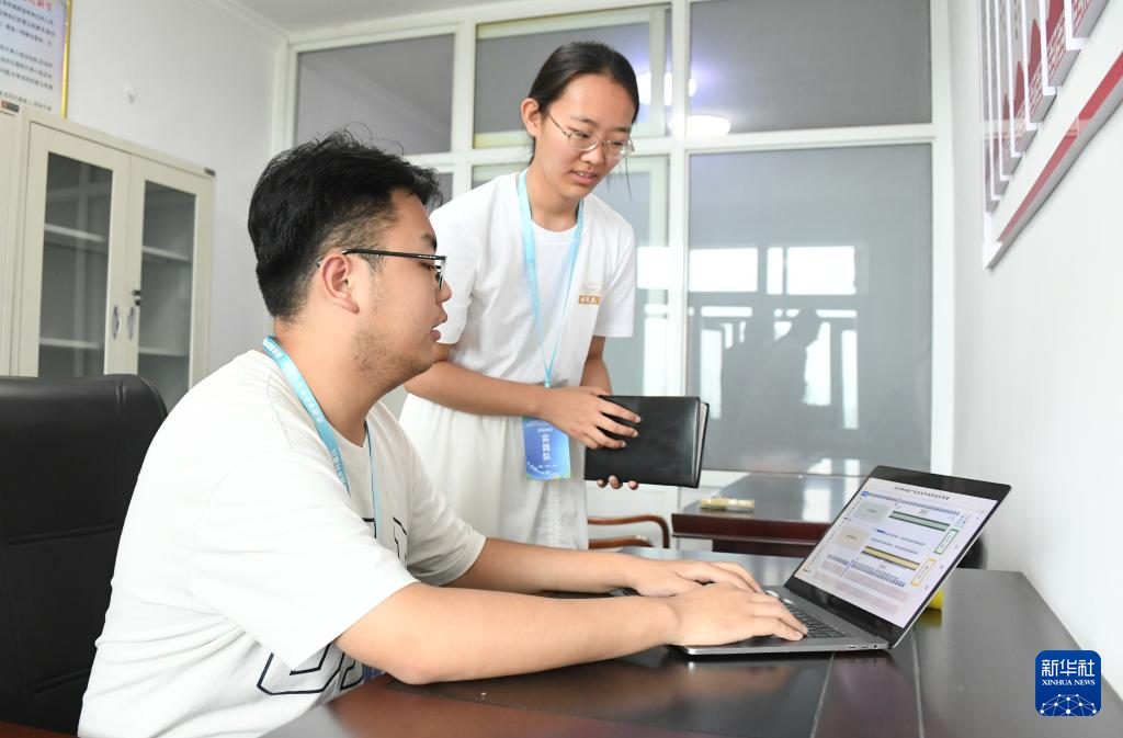 7月11日,在北京市平谷区平谷镇东寺渠村村委会,中央财经大学学生黄加豪(前)与同学李研讨论东寺渠批发市场规划方案(7月11日摄)。