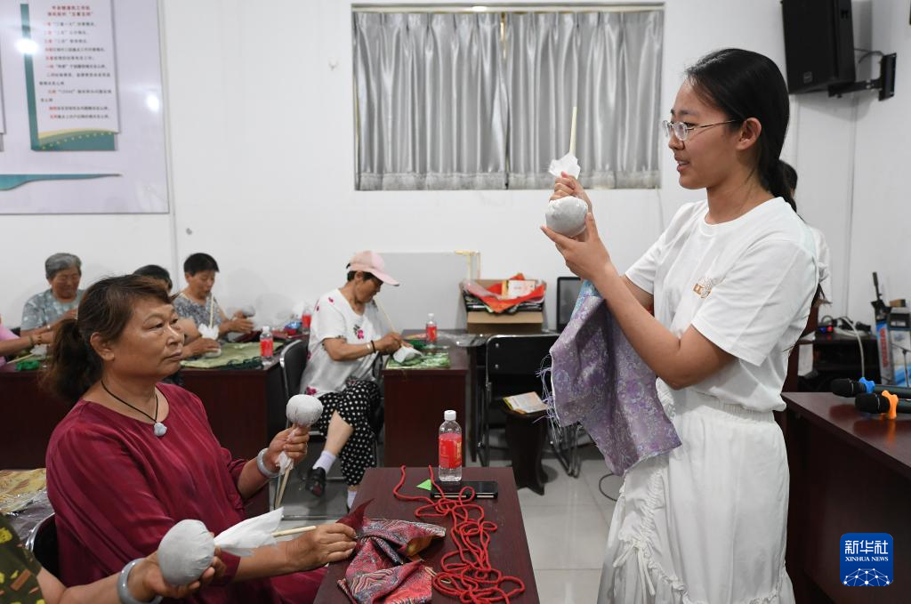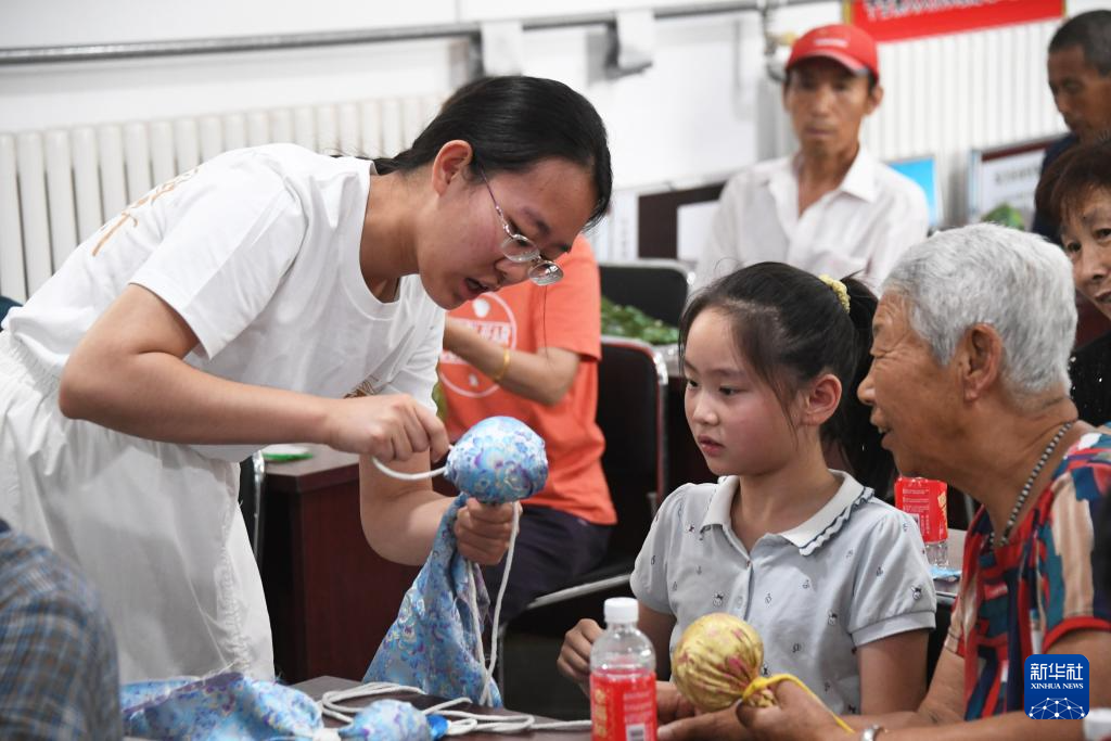 7月11日,在北京市平谷区平谷镇东寺渠村村委会,中央财经大学学生李研(右一)为村民上“村课”。