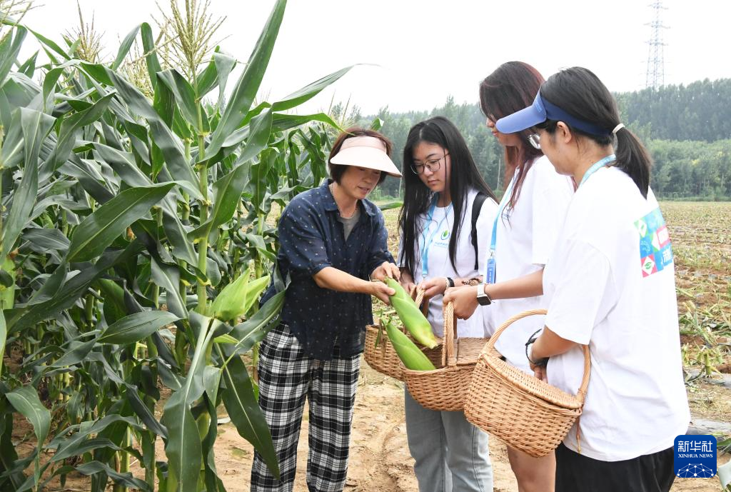 7月11日,在北京市平谷区平谷镇北台头村的一处玉米地,中国农业大学学生石艳姣(左二)、姜黎雨(右二)、孙元勤(右一)与村民一起采摘玉米。
