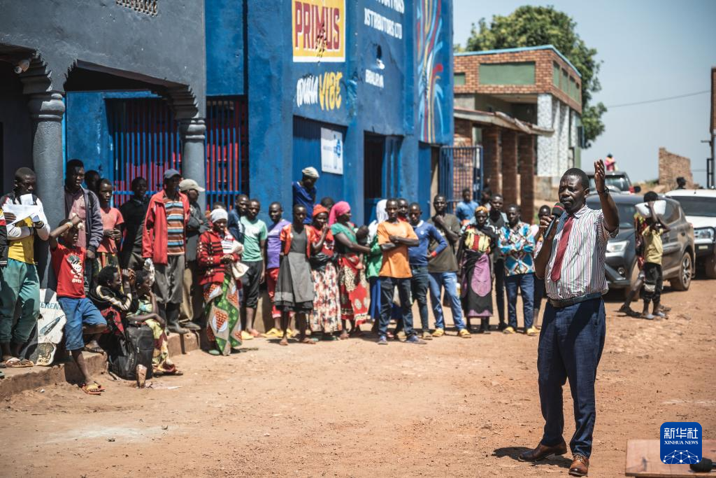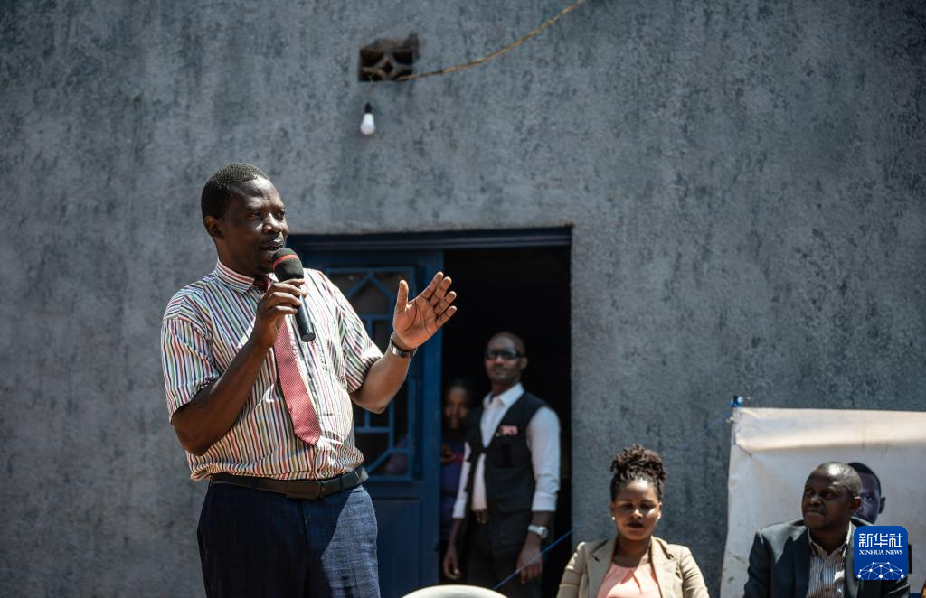 7月13日,在卢旺达吉昆比,独立候选人菲利普·姆帕伊马纳(左一)进行竞选演讲。