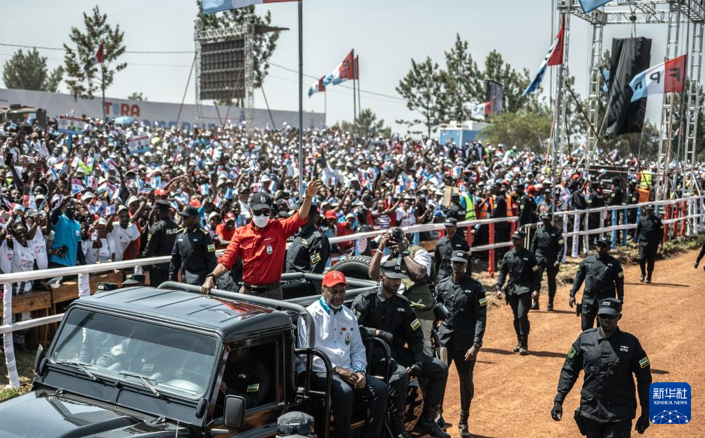 7月12日,卢旺达现任总统、卢旺达爱国阵线总统候选人保罗·卡加梅(前左一)在首都基加利举行的竞选活动上向支持者致意。