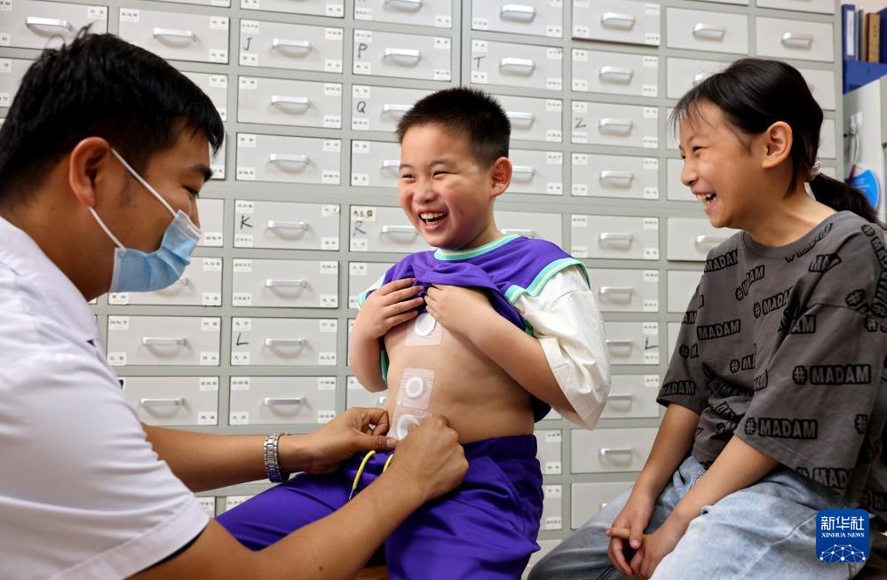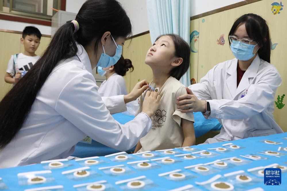 7月15日,在山东省滕州市中医医院,医务人员为小朋友贴“三伏贴”。