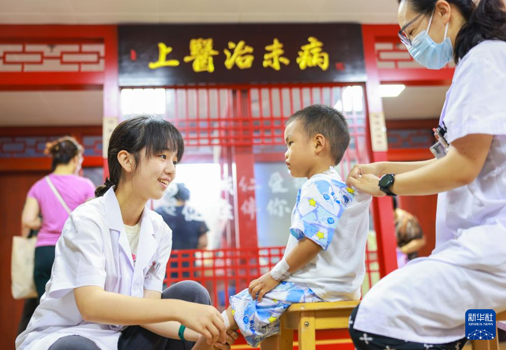 7月15日,在浙江省湖州市德清县下渚湖街道卫生院中药馆,医务人员为小朋友贴“三伏贴”。