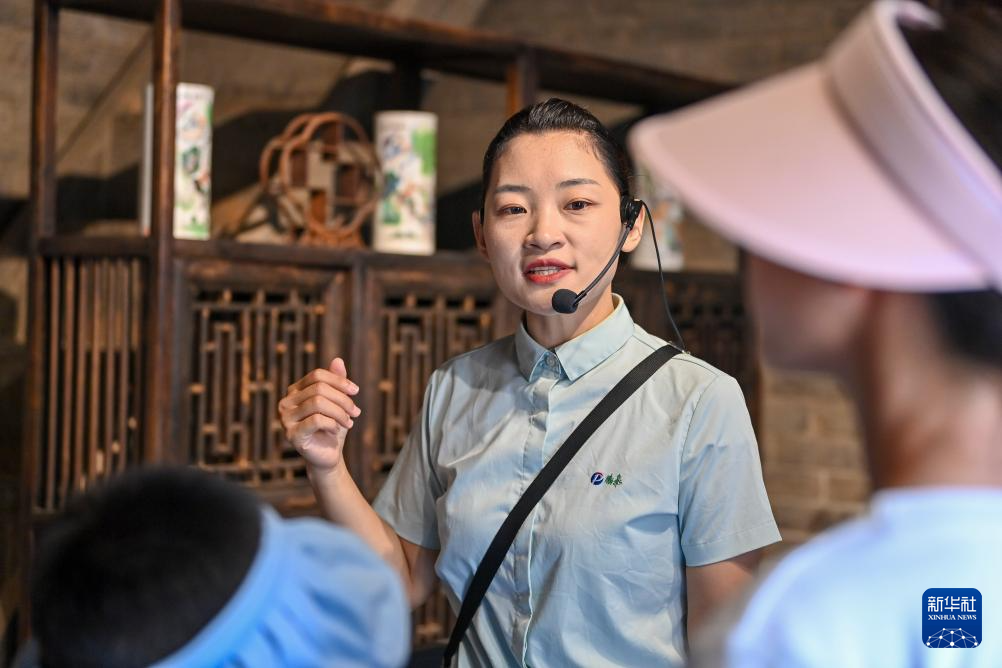 身为导游的湘峪村村民史利在湘峪古堡内为游客讲解(7月10日摄)。