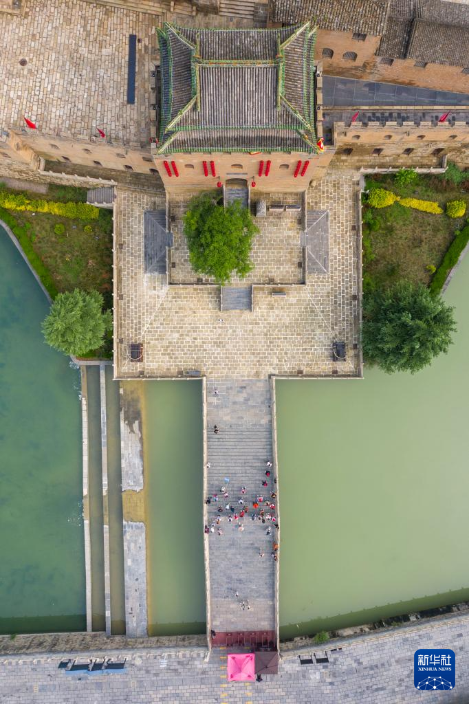 游客参观湘峪古堡(7月11日摄,无人机照片)。
