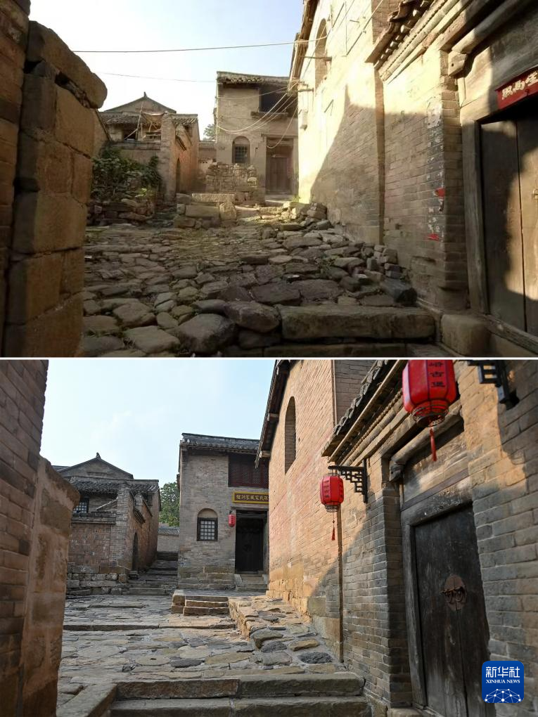 拼版照片:上图为湘峪古堡内一处街道修缮前的景象(资料照片);下图为7月11日拍摄的湘峪古堡内一处街道修缮后的景象(新华社记者杨晨光摄)。