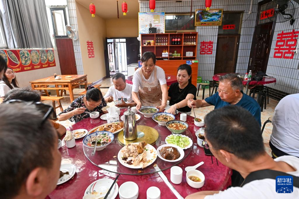 湘峪村村民连小霞在自家的农家乐为游客准备当地传统的“八八宴”(7月9日摄)。