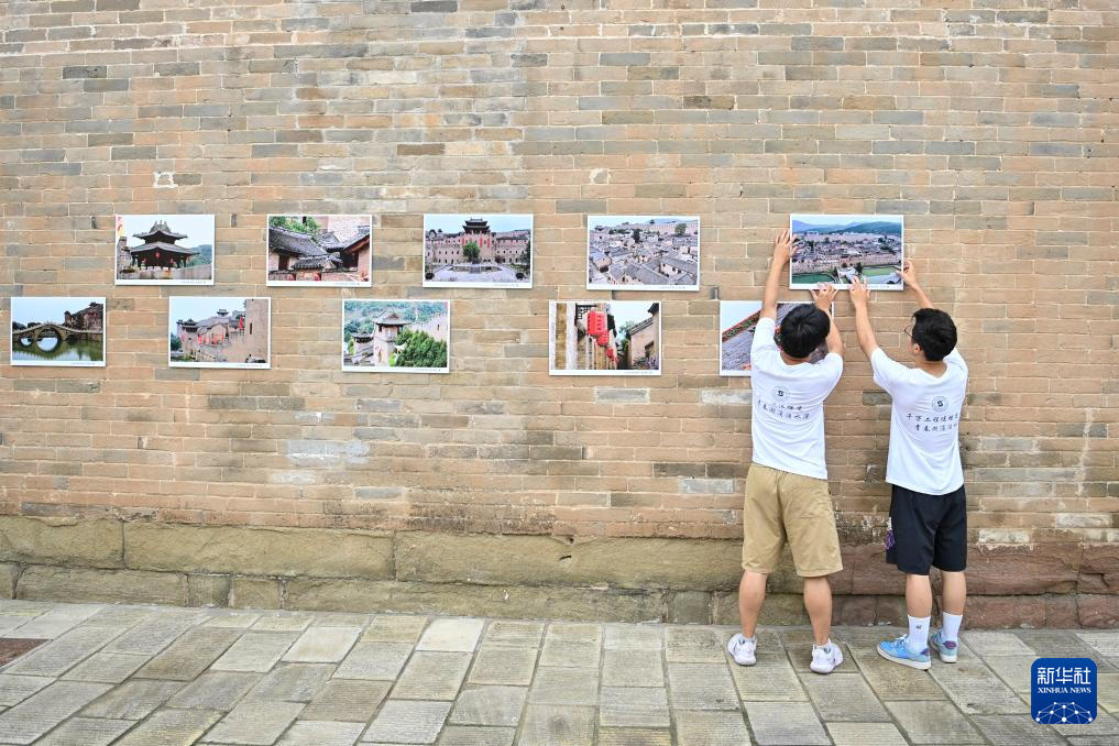 山西科技学院的学生在湘峪古堡内张贴摄影作品(7月10日摄)。