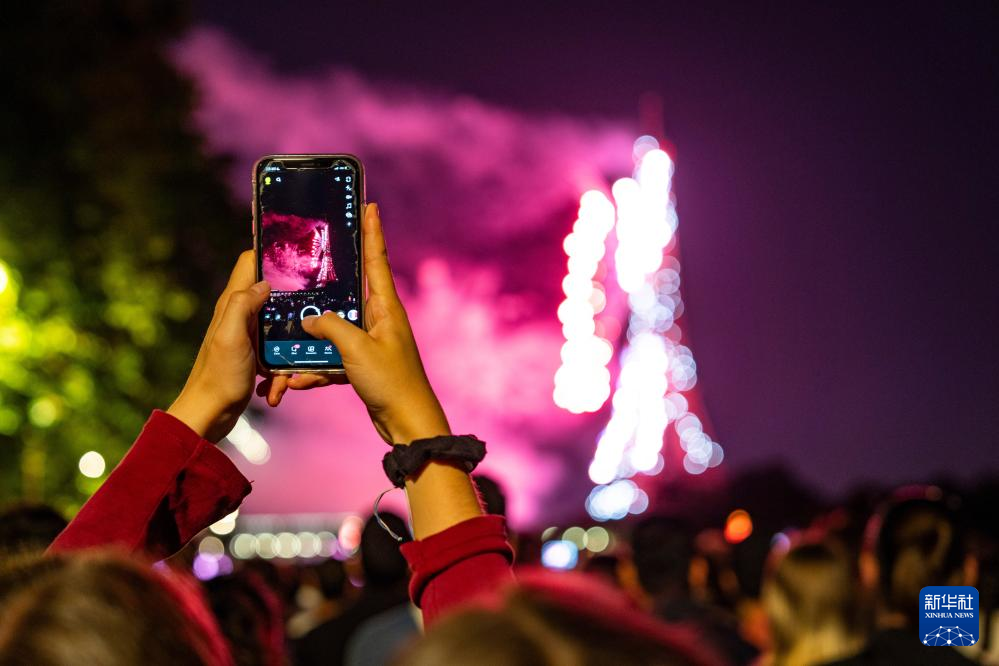 7月14日,观众在法国巴黎埃菲尔铁塔附近拍摄焰火。
