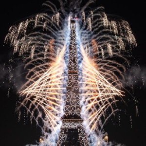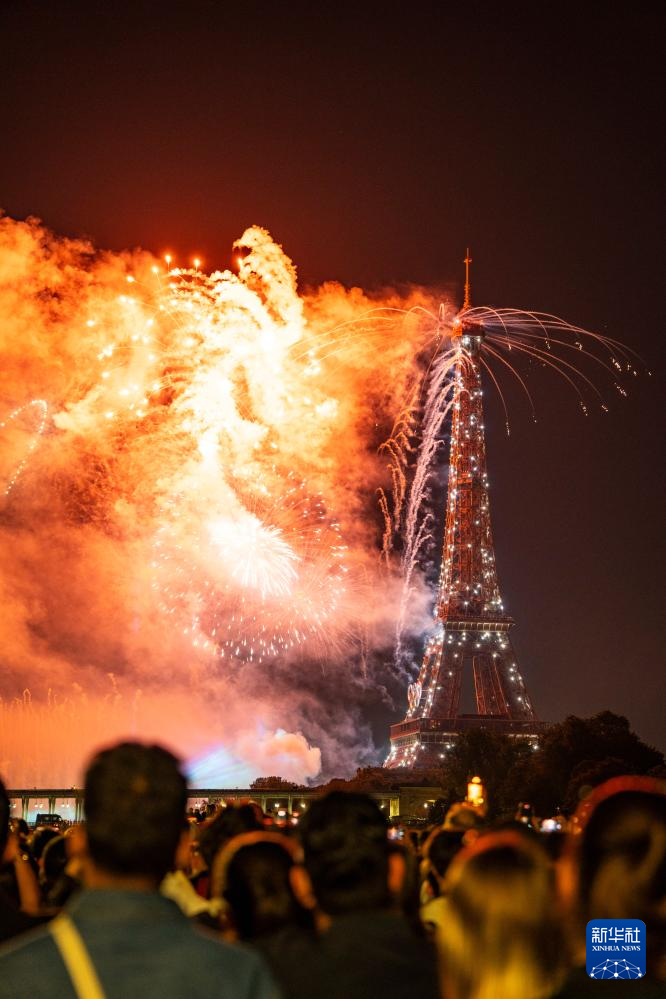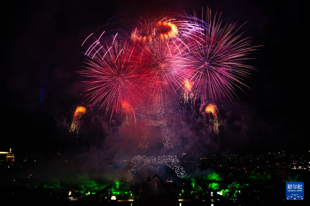 7月14日,焰火在法国巴黎埃菲尔铁塔周围绽放。