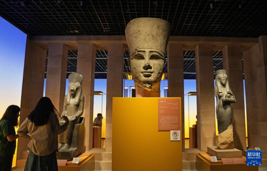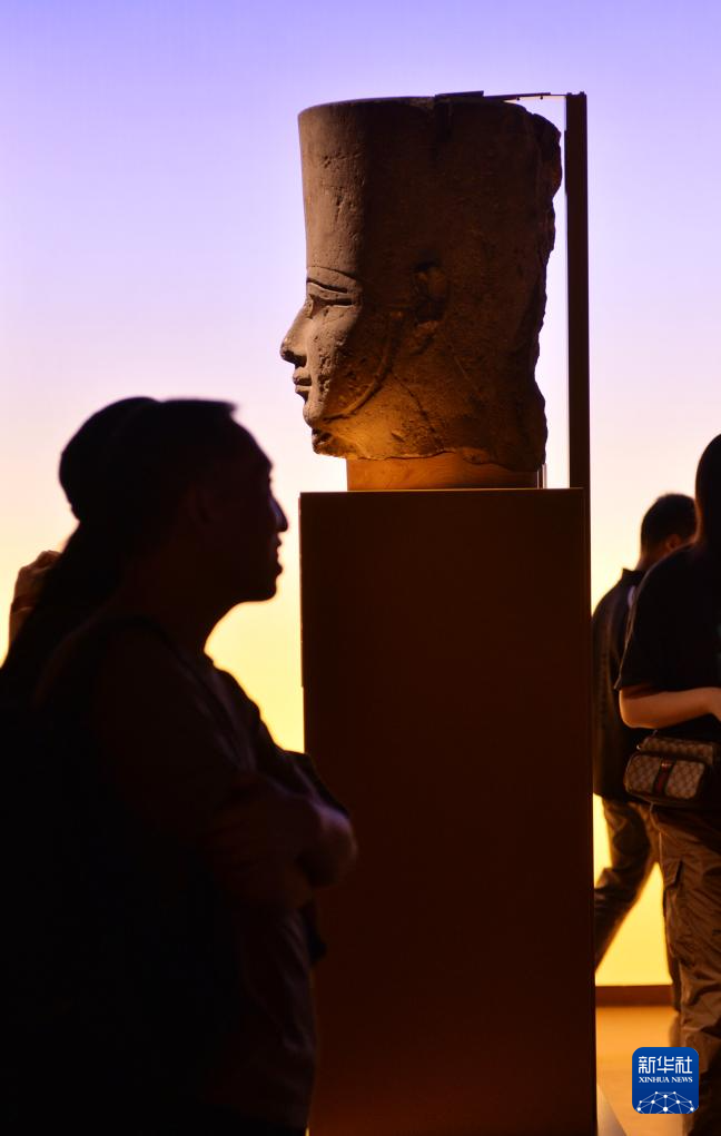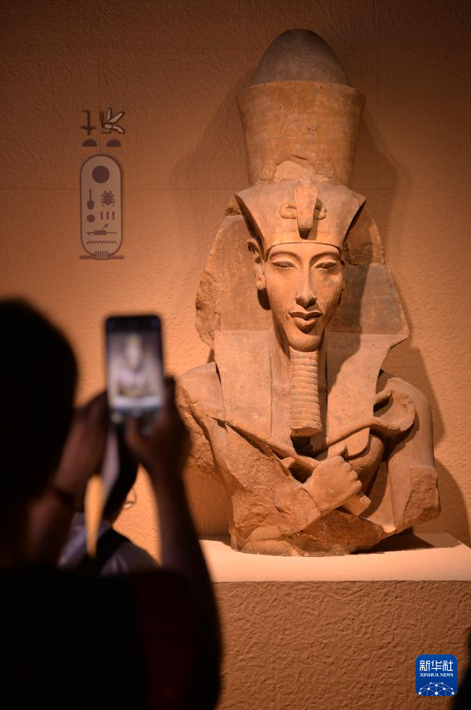 “法老的国度”展区展示的舍本索普度特塑像(7月16日摄)。