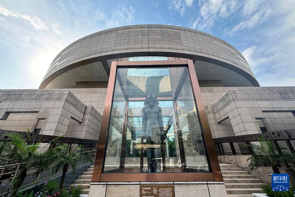 7月17日在上海博物馆人民广场馆南门拍摄的美内普塔站像。该像高2.4米,重2吨多,这是上海博物馆首次把文物展品放在室外展出。