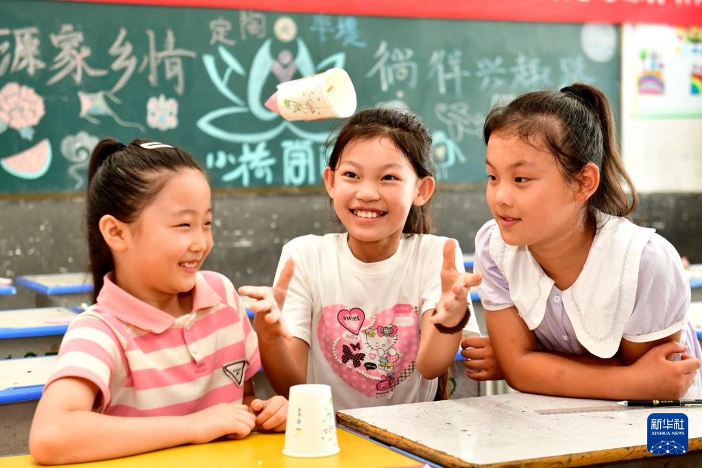 7月19日,在菏泽市定陶区半堤镇“小荷学堂”,孩子们在做纸杯火箭小实验。