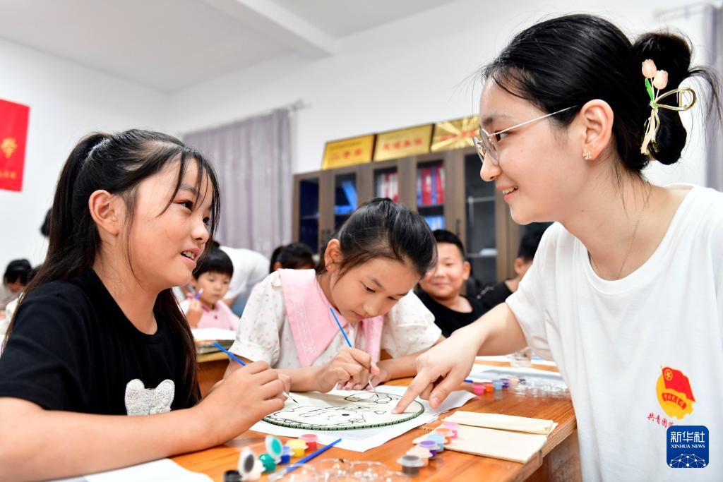 7月18日,在菏泽市牡丹区高庄镇燕王庄村“小荷学堂”,来自青岛理工大学的志愿者和孩子一起做团扇。