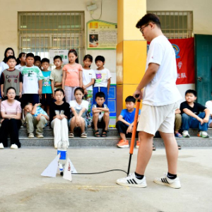 7月19日,在菏泽市定陶区半堤镇“小荷学堂”,来自青岛理工大学的志愿者为孩子们做气压式喷水火箭小实验。