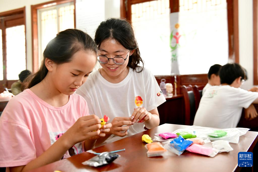 7月19日,在菏泽市定陶区仿山镇“小荷学堂”,来自青岛理工大学的志愿者和孩子们一起做泥塑。