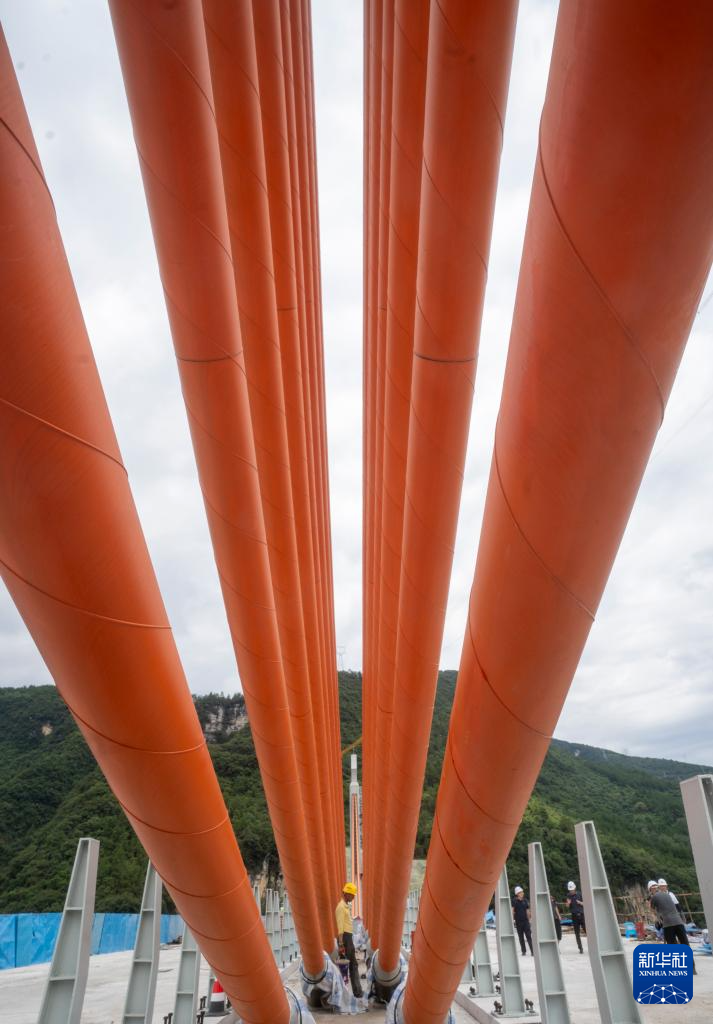 这是位于重庆市彭水县境内的渝湘复线高速磨寨乌江特大桥建设现场(7月20日摄,无人机照片)。
