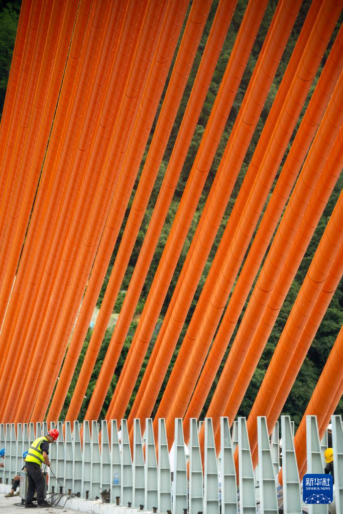 7月20日,工人在渝湘复线高速磨寨乌江特大桥建设现场施工作业。
