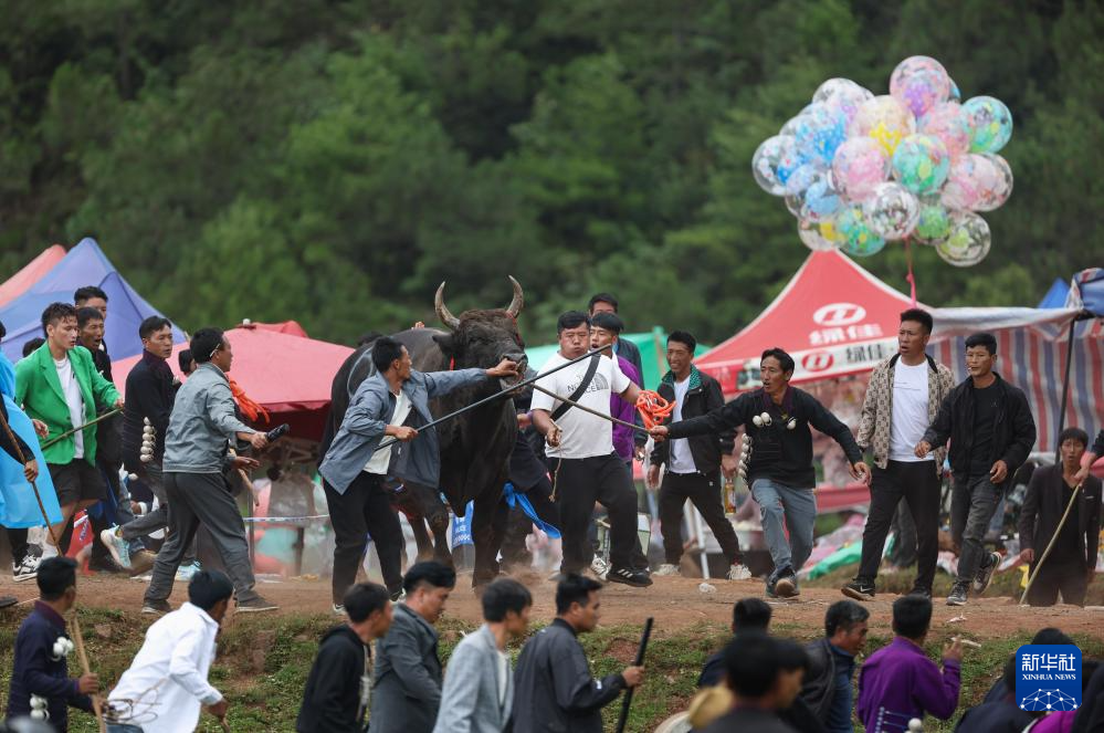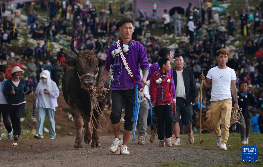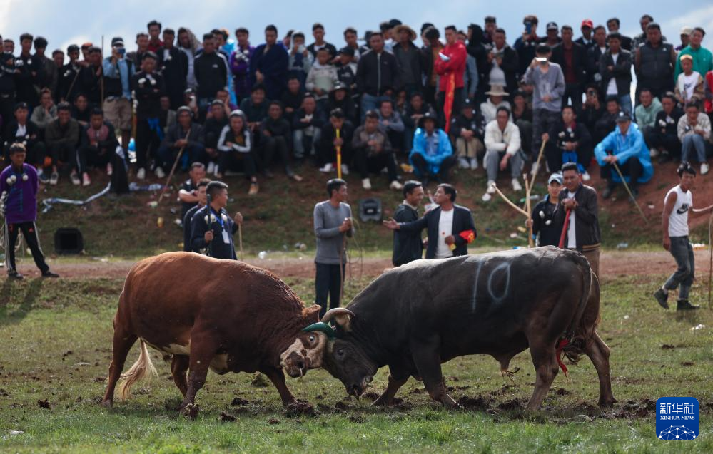 斗牛,彝语意为“牛顶”,与西班牙斗牛人与牛斗不同,是两匹公牛之间相斗。比赛时参赛的公牛被牵到一起进行顶力和耐力较量,直至一方体力不支夺路而逃。胜者高昂着头,牛的主人也高兴不已,败方则垂头丧气,现场时时引发观众欢呼。