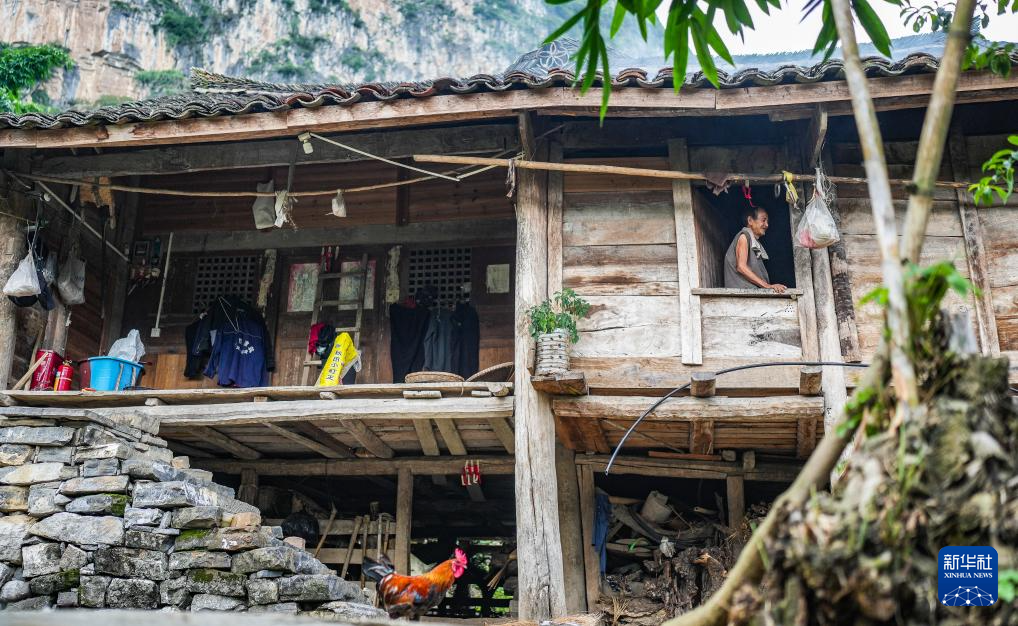 天门村村民王仕洪从吊脚楼走下(7月17日摄)。