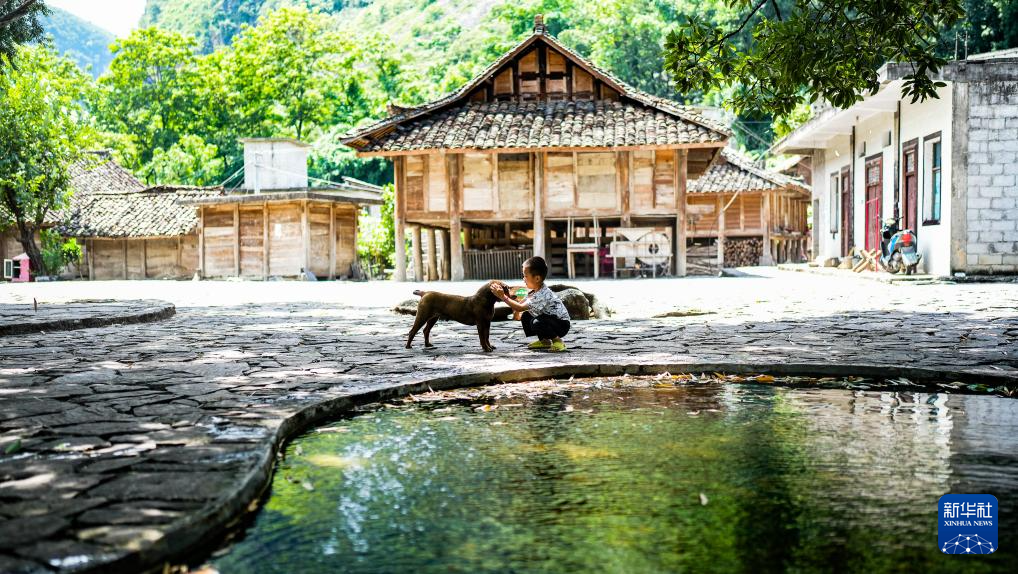 小朋友在天门村和小狗玩耍(7月16日摄)。