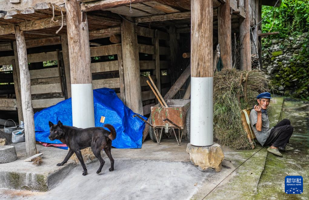 天门村村民陆风选干完农活返回自家吊脚楼下(7月16日摄)。