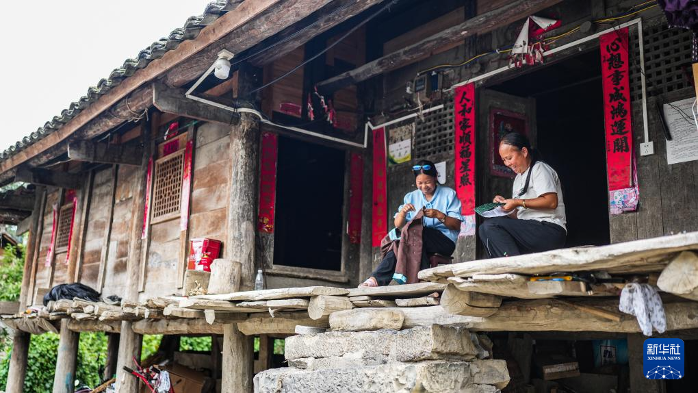 天门村村民陆大珍(左)、王兴珍在吊脚楼上制作绣片(7月16日摄)。