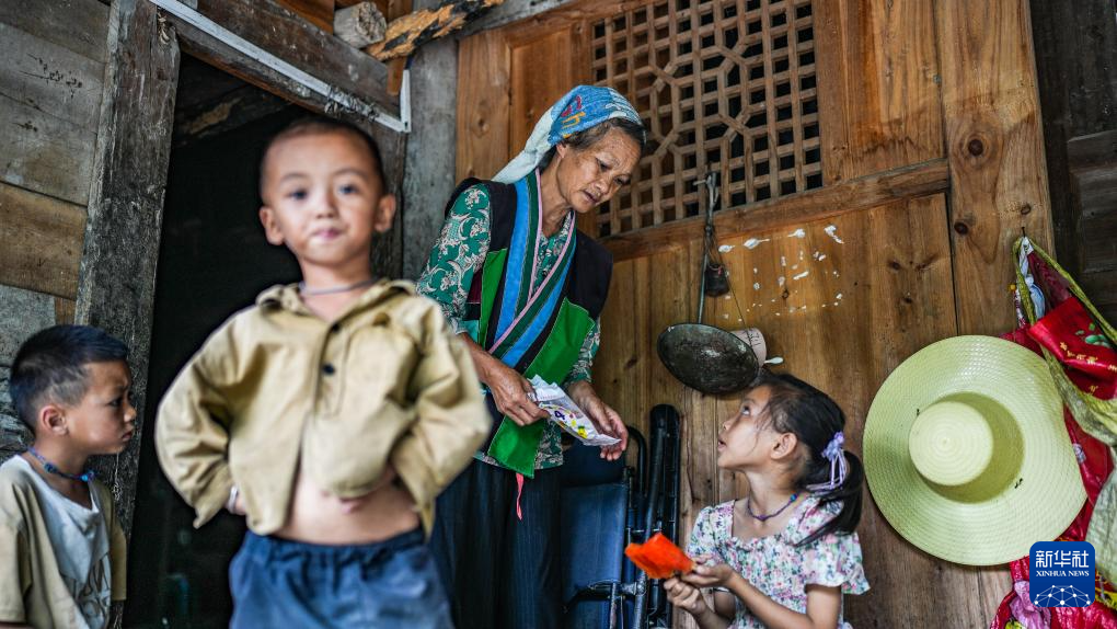 天门村村民陆凤给孙女和孙子发冰棒(7月16日摄)。