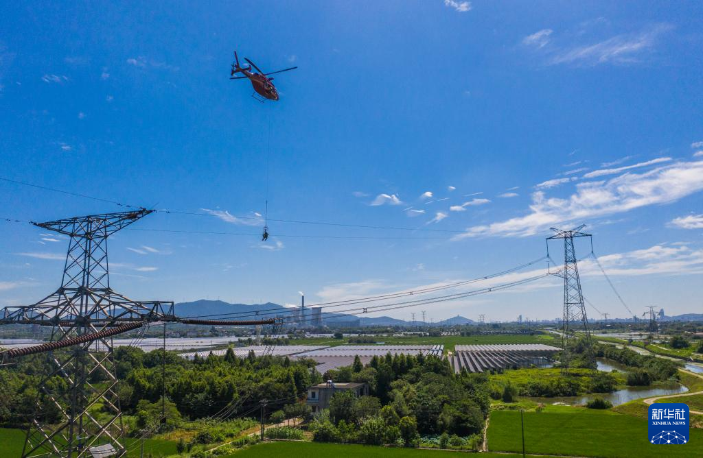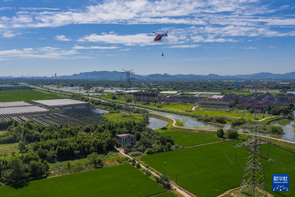 7月24日,在浙江湖州市长兴县吕胥线附近,一架直升机运送带电作业人员至超特高压线路检修点作业。