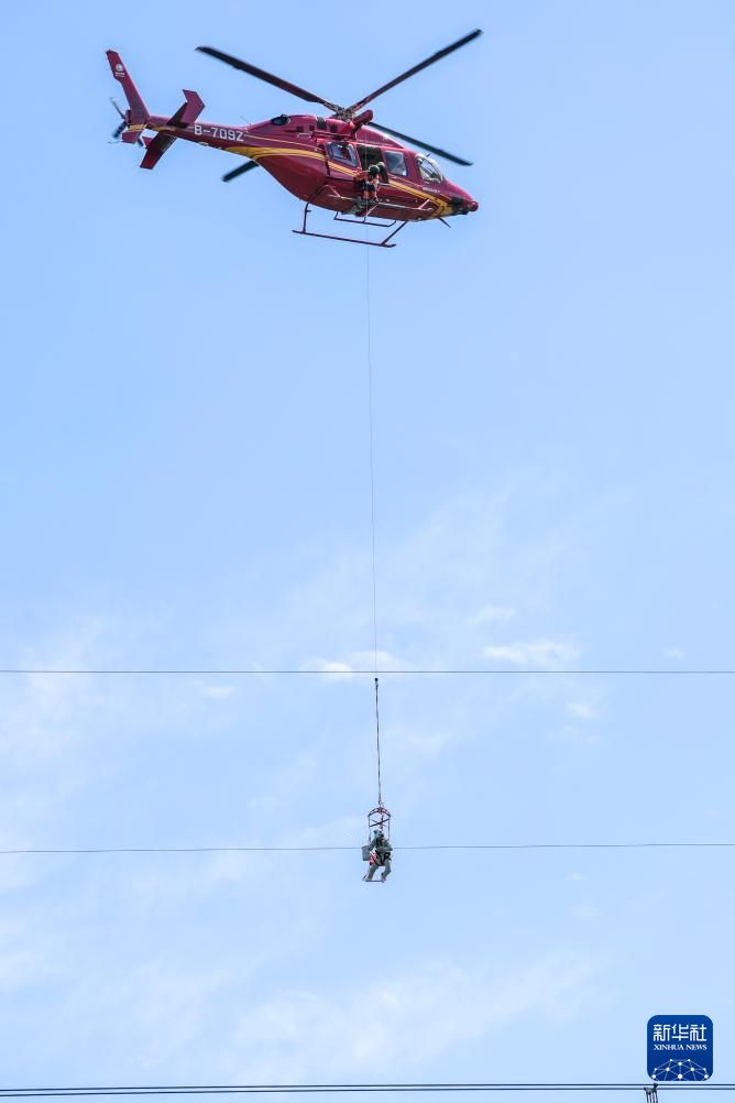 7月24日,在浙江湖州市长兴县吕胥线附近,国家电网带电作业人员在直升机吊运下到达超特高压线路检修点进行检修。