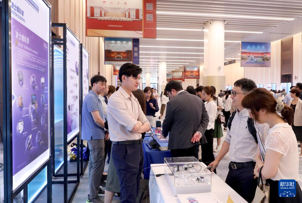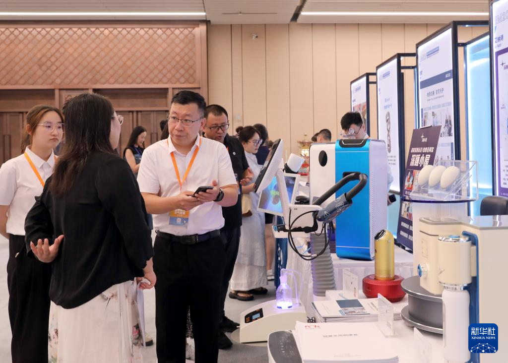 7月24日,企业工作人员(左三)在对接会场外展示区向参观者做产品介绍。