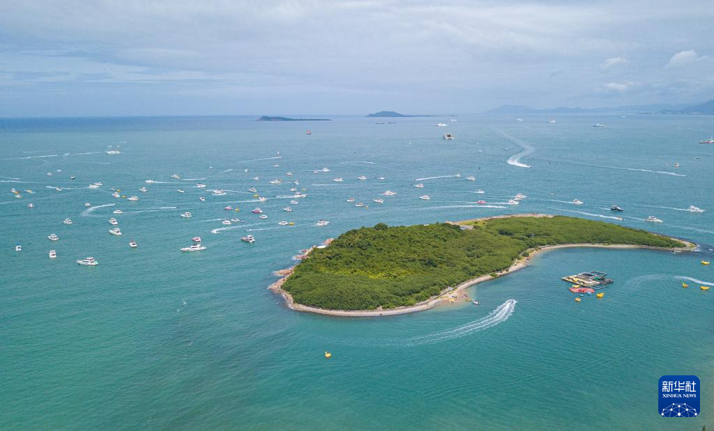 7月23日,众多游客乘游艇在海南省三亚市游玩(无人机照片)。