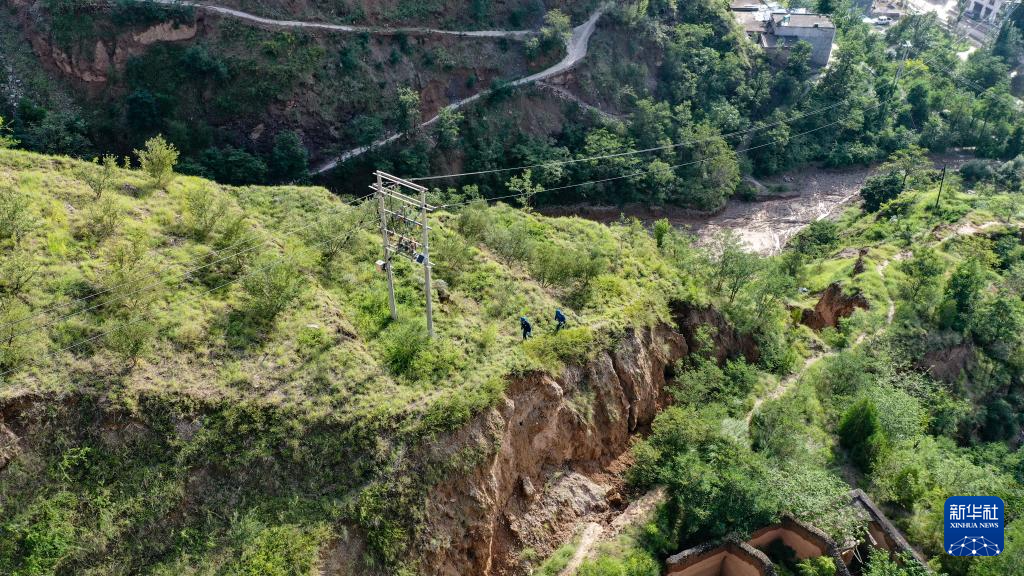 7月25日,在甘肃省陇南市武都区三河镇竹林村,电力员工沿着山坡开展线路巡视巡查工作(无人机照片)。