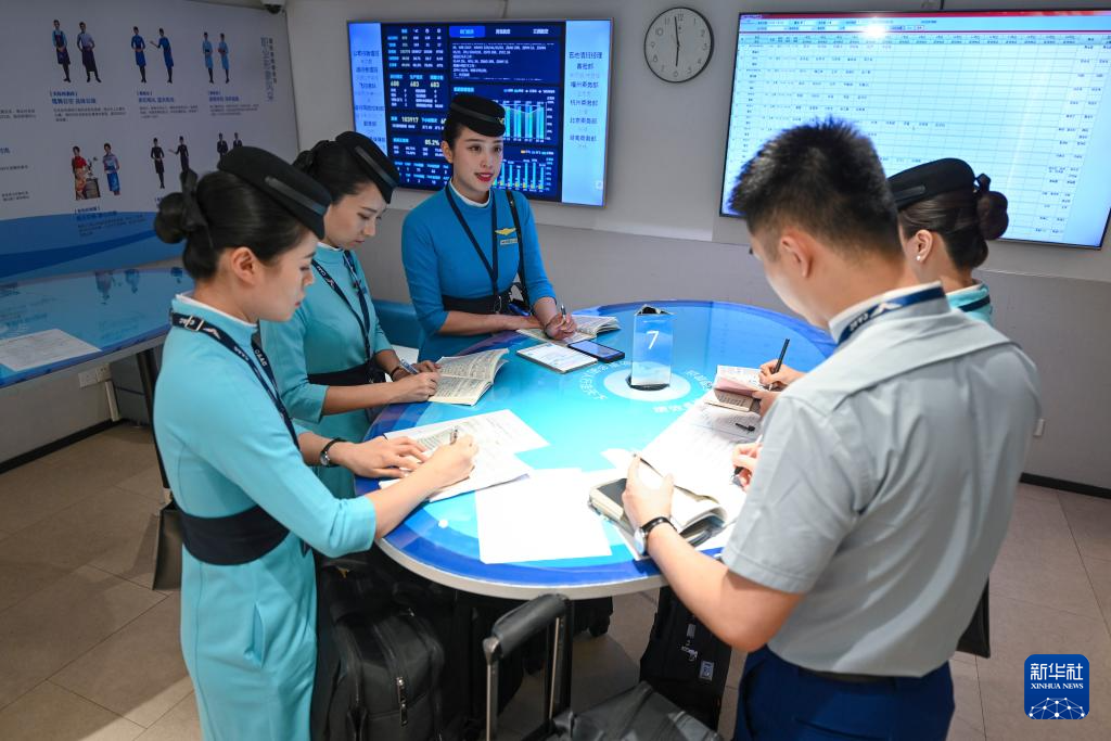 7月18日,陈于萱(左三)和同事在厦门航空乘务运行中心做航前准备工作。